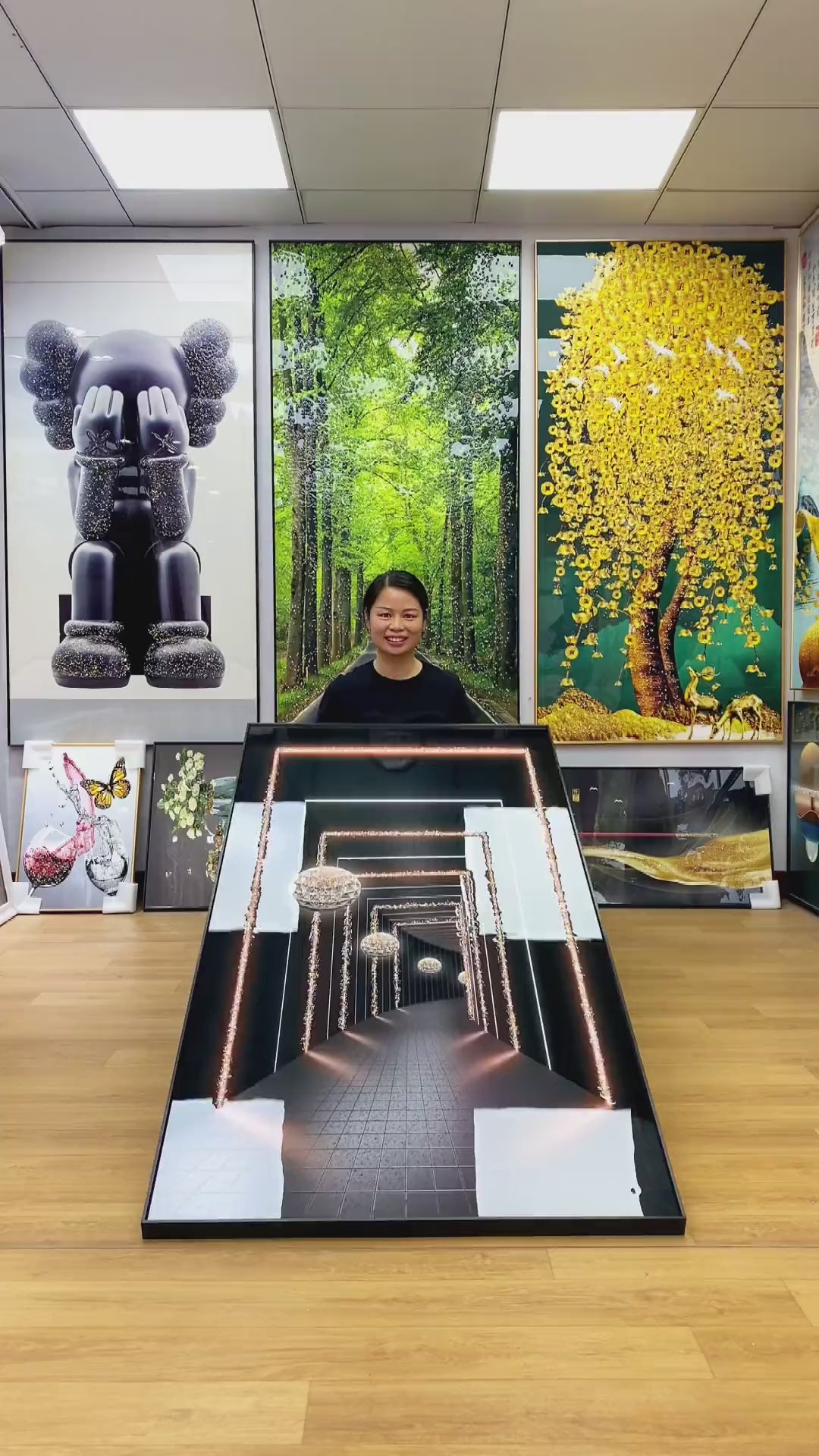 All of our art paintings are framed in aluminum. It has a brushed metal surface texture. This material makes the painting lighter and easier to hang.