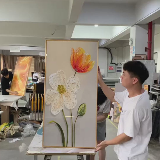All of our art paintings are framed in aluminum. It has a brushed metal surface texture. This material makes the painting lighter and easier to hang.